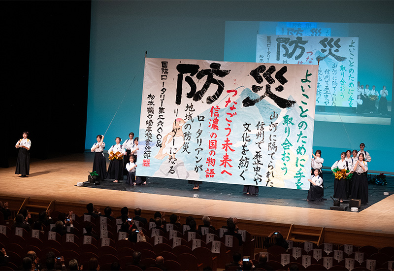 会場のキッセイ文化ホールでは、防災用品の展示が行われ、午前はご来賓挨拶と青少年アワー、午後のアトラクションでは防災・減災をテーマに、松本蟻ヶ崎高校書道部の実演や山形村の勇壮な彌磨太鼓の演奏が披露されました。圧巻は、友愛劇団による記念演劇「守れ 命と郷土 その時ロータリアンはどうする?」です。本物の消防士たちによる迫真の演技とオリジナル脚本のストーリーは、参加者の防災意識を一段と高めるものでした。